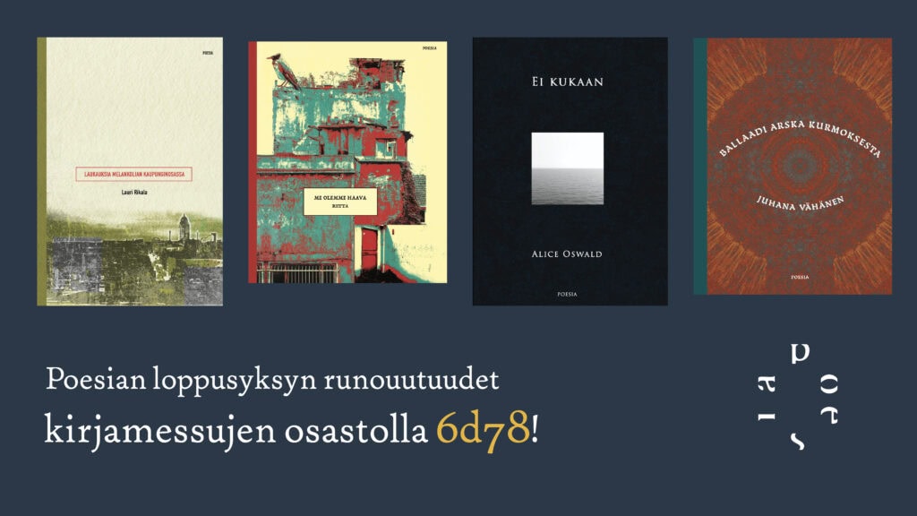 Löydät koko Poesian laajan tarjooman sekä loppusyksyn uutuudet messuosastoltamme 6d78. Luvassa myös kiinnostavaa poesialaiskeskustelua runouden ja kirjallisuuden ajankohtaisuuksista, tutustu ohjelmaan tarkemmin täällä.